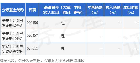 证券之星消息,11月3日平安基金管理有限公司发布《关于平安上证红利低波动指数型证券投资基金暂停大额申购、定期定额投资及转换转入业务的公告》。公告中提示,为了保证基金的平稳运作,保护基金持有人的利益,自2025年11月4日起平安上证红利低波动指数型证券投资基金暂停大额申购、定期定额投资及转换转入业务,申购、转换转入、定投上限金额为500.0万元,下属分级基金调整明细如下: