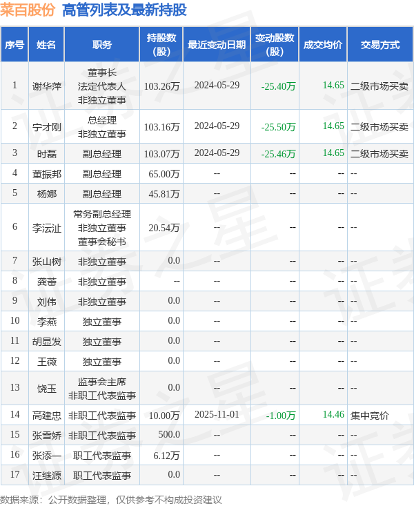 菜百股份近半年内的董监高及核心技术人员增减持详情如下: