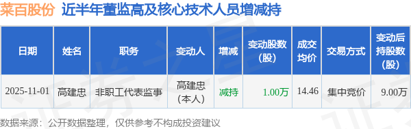 证券之星消息,根据11月3日市场公开信息、上市公司公告及交易所披露数据整理,菜百股份(605599)最新董监高及相关人员股份变动情况:2025年11月1日公司非职工代表监事高建忠共减持公司股份1.0万股,占公司总股本为0.0013%。变动期间公司股价上涨0.0%,10月31日当日收盘报14.42元。