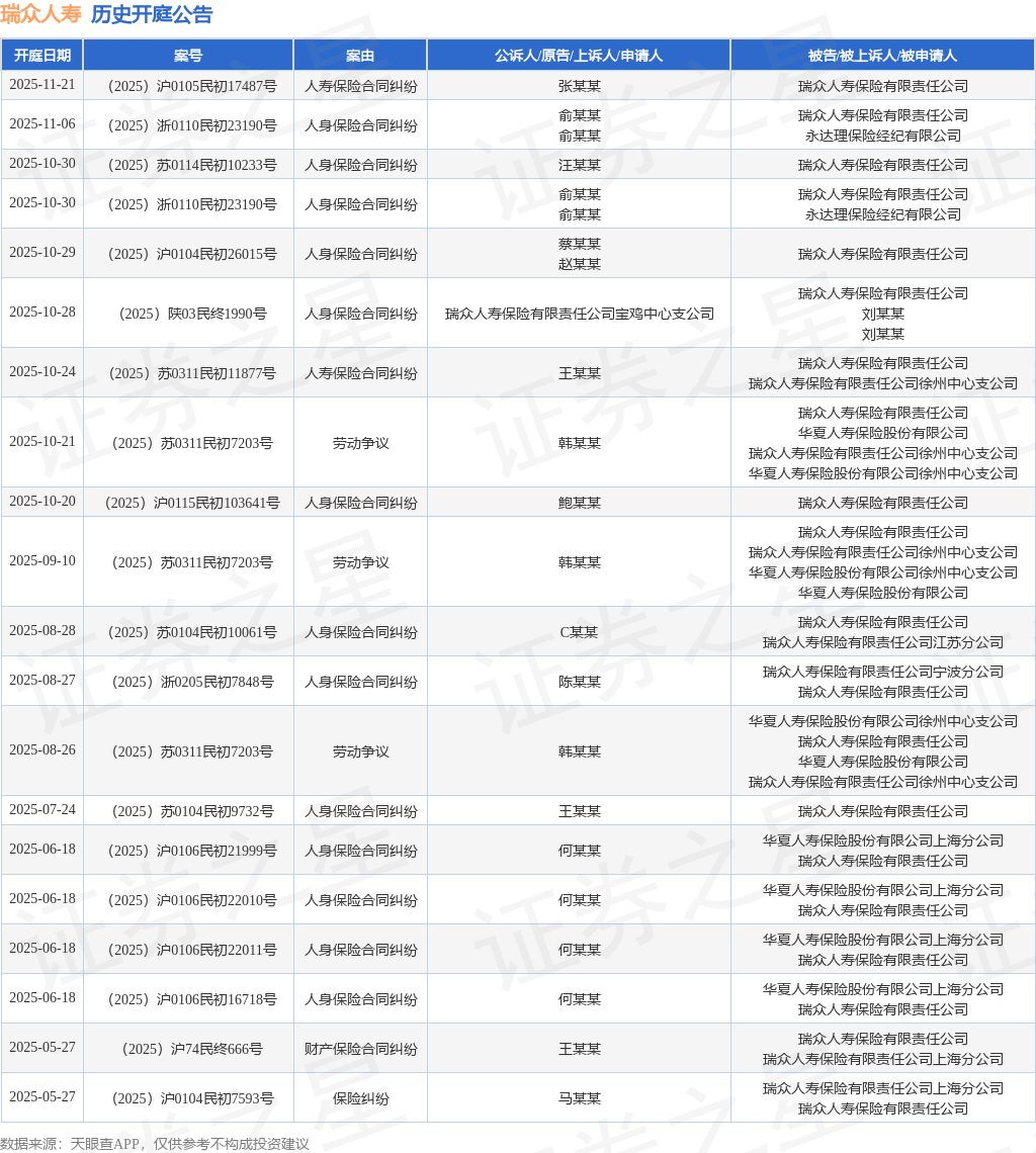 根据统计,近一年内以瑞众人寿保险有限责任公司为当事人的历史开庭公告有56则,其中案由为“人身保险合同纠纷”的公告以24则居首,其次为“人寿保险合同纠纷”有12则,“财产保险合同纠纷”有8则。历史开庭公告(前20条)如下: