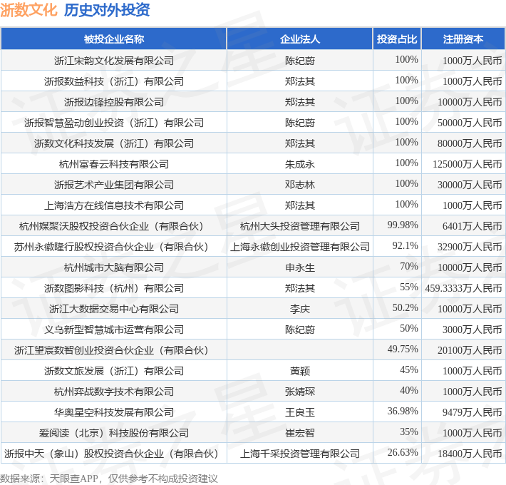 证券之星消息,根据天眼查APP显示,浙数文化(600633.SH)新增一起对外投资事件,被投资公司为浙江望宸数智创业投资合伙企业(有限合伙),法定代表人,投资占比为49.75%。该公司从事资本市场服务,注册资本为20100万人民币。目前,浙数文化共存在对外投资32项,投资占比前20的项目见下表: