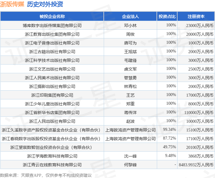 通过天眼查大数据分析,浙江出版传媒股份有限公司共对外投资了16家企业,参与招投标项目392次;财产线索方面有商标信息54条;此外企业还拥有行政许可5个。据2024年报数据,浙版传媒长期股权投资3.75亿元,同比增25.76%。