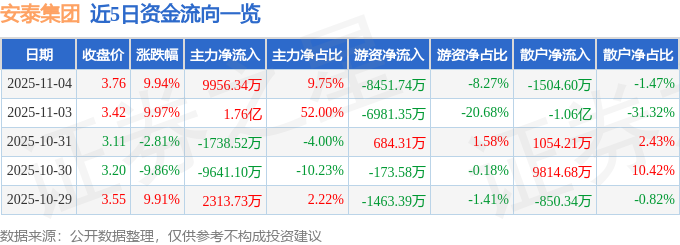 证券之星消息,安泰集团11月4日涨停收盘,收盘价3.76元。该股于9点36分涨停,14次打开涨停,截止收盘封单资金为658.26万元,占其流通市值0.17%。