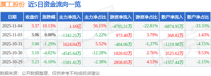 11月4日的资金流向数据方面,主力资金净流入1.16亿元,占总成交额56.15%,游资资金净流出4705.51万元,占总成交额22.81%,散户资金净流出6874.95万元,占总成交额33.33%。