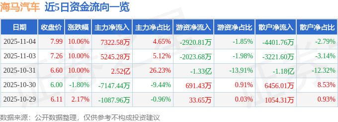 证券之星消息,海马汽车11月4日涨停收盘,收盘价7.99元。该股于9点32分涨停,4次打开涨停,截止收盘封单资金为1.61亿元,占其流通市值1.23%。