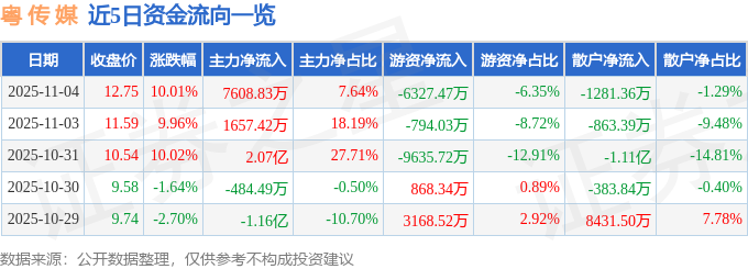 证券之星消息,粤 传 媒11月4日涨停收盘,收盘价12.75元。该股于9点30分涨停,1次打开涨停,截止收盘封单资金为1.1亿元,占其流通市值0.76%。