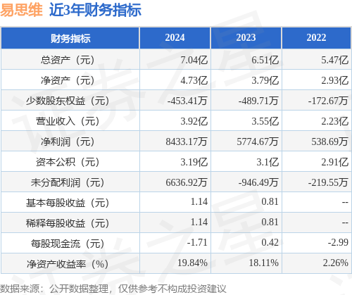 从目前公布的财报来看,易思维2024年总资产为7.04亿元,净资产为4.73亿元;近3年净利润分别为8433.17万元(2024年),5774.67万元(2023年),538.69万元(2022年)。详情见下表: