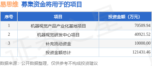 证券之星消息,易思维(杭州)科技股份有限公司(简称:易思维)拟在上交所科创板上市,募资总金额为12.14亿元,保荐机构为国投证券股份有限公司。募集资金拟用于机器视觉产品产业化基地项目、机器视觉研发中心项目、补充流动资金,详见下表: