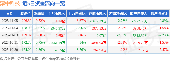 11月5日的资金流向数据方面,主力资金净流入1.14亿元,占总成交额3.67%,游资资金净流出8642.29万元,占总成交额2.78%,散户资金净流出2772.55万元,占总成交额0.89%。