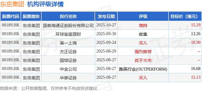 投行对该股的评级以买入为主,近90天内共有2家投行给出买入评级,近90天的目标均价为15.85港元。国泰海通证券股份有限公司最新一份研报给予东岳集团增持评级,目标价15.29港元。