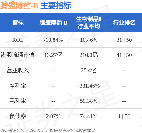 腾盛博药-B港股市值13.27亿港元,在生物制品Ⅱ行业中排名第41。主要指标见下表: