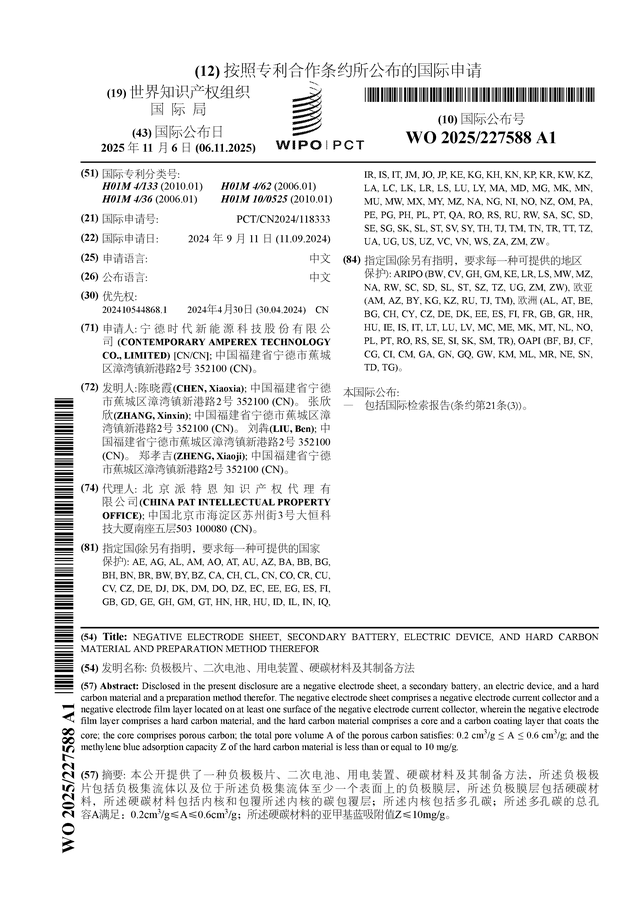 证券之星消息,根据企查查数据显示宁德时代(300750)公布了一项国际专利申请,专利名为“负极极片、二次电池、用电装置、硬碳材料及其制备方法”,专利申请号为PCT/CN2024/118333,国际公布日为2025年11月6日。