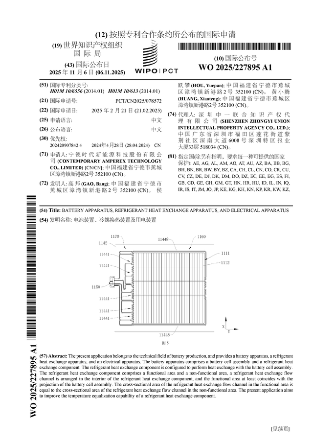 证券之星消息,根据企查查数据显示宁德时代(300750)公布了一项国际专利申请,专利名为“电池装置、冷媒换热装置及用电装置”,专利申请号为PCT/CN2025/078572,国际公布日为2025年11月6日。