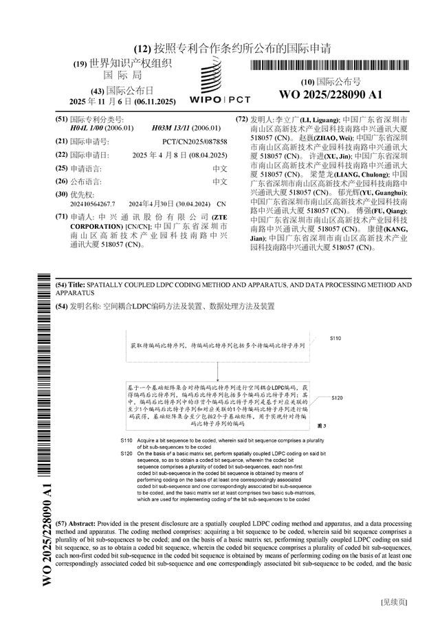 证券之星消息,根据企查查数据显示中兴通讯(000063)公布了一项国际专利申请,专利名为“空间耦合LDPC编码方法及装置、数据处理方法及装置”,专利申请号为PCT/CN2025/087858,国际公布日为2025年11月6日。