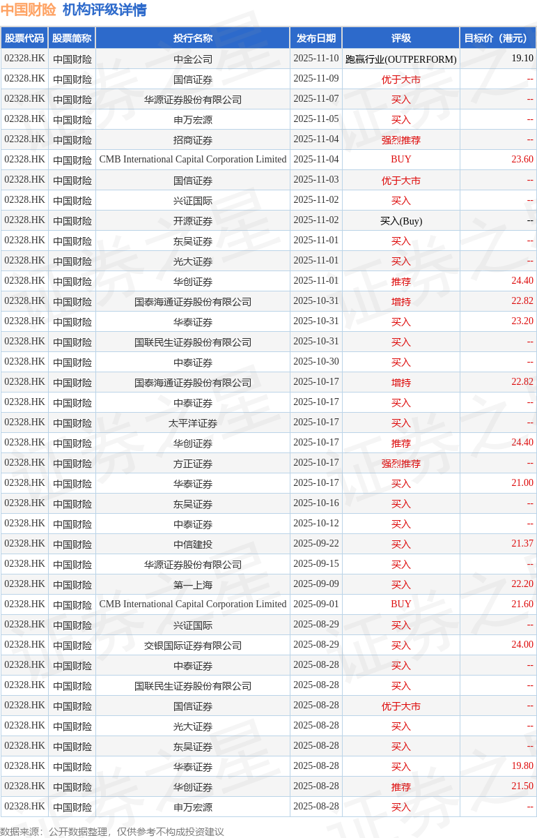 投行对该股的评级以买入为主,近90天内共有24家投行给出买入评级,近90天的目标均价为22.27港元。中金公司最新一份研报给予中国财险跑赢行业(OUTPERFORM)评级,目标价19.1港元。