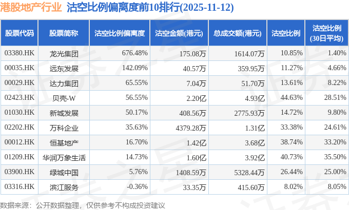 从沽空比例偏离度来看,龙光集团、远东发展、达力集团沽空比例偏离度位居行业前三,分别为676.48%、142.09%、65.55%。
