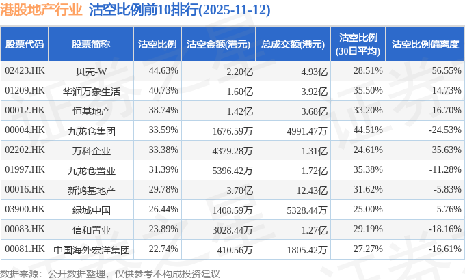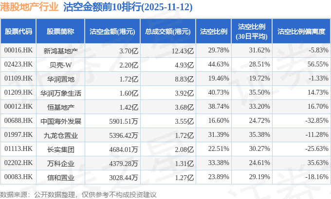 从沽空金额来看,新鸿基地产、贝壳-W、华润置地沽空金额位居行业前三,分别为3.7亿港元、2.2亿港元、1.72亿港元。