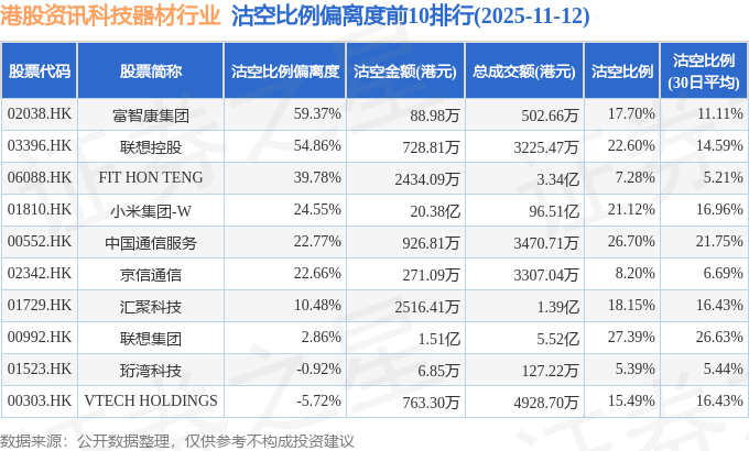 从沽空比例偏离度来看,富智康集团、联想控股、FIT HON TENG沽空比例偏离度位居行业前三,分别为59.37%、54.86%、39.78%。