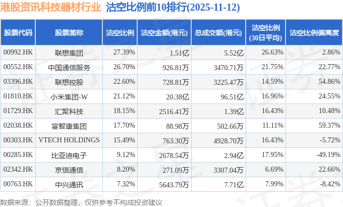 从沽空比例来看,联想集团、中国通信服务、联想控股沽空比例位居行业前三,分别为27.39%、26.7%、22.6%。