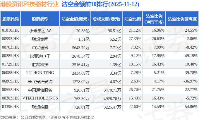 从沽空金额来看,小米集团-W、联想集团、中兴通讯沽空金额位居行业前三,分别为20.38亿港元、1.51亿港元、5643.79万港元。