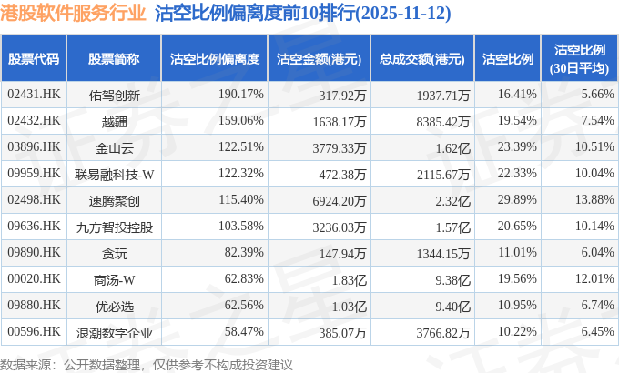 从沽空比例偏离度来看,佑驾创新、越疆、金山云沽空比例偏离度位居行业前三,分别为190.17%、159.06%、122.51%。