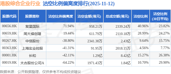 从沽空比例偏离度来看,复星国际、周大福创建、中信股份沽空比例偏离度位居行业前三,分别为71.94%、19.44%、-38.8%。