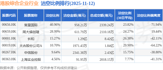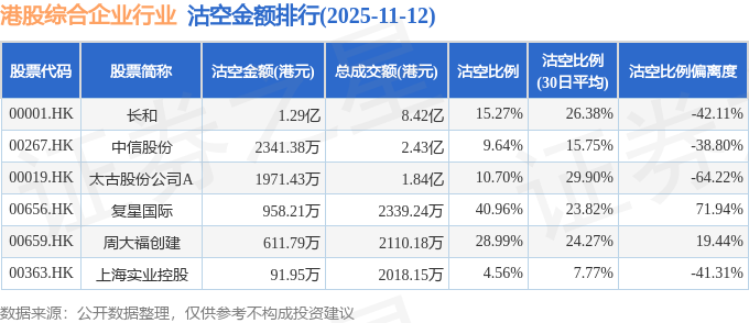 从沽空金额来看,长和、中信股份、太古股份公司A沽空金额位居行业前三,分别为1.29亿港元、2341.38万港元、1971.43万港元。