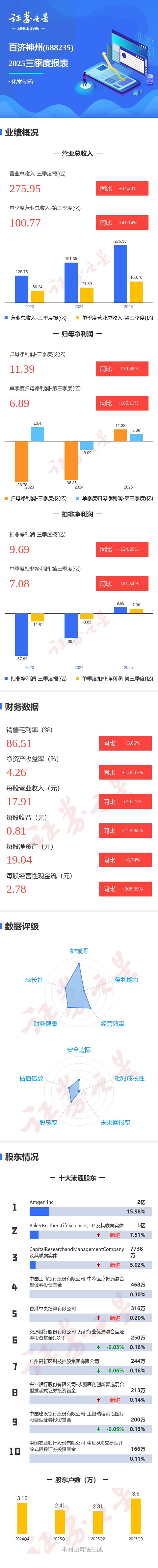 证券之星消息,百济神州2025年三季报显示,前三季度公司主营收入275.95亿元,同比上升44.21%;归母净利润11.39亿元,同比上升130.88%;扣非净利润9.69亿元,同比上升124.3%;其中2025年第三季度,公司单季度主营收入100.77亿元,同比上升41.14%;单季度归母净利润6.89亿元,同比上升185.11%;单季度扣非净利润7.08亿元,同比上升181.85%;负债率45.75%,投资收益7419.9万元,财务费用1.17亿元,毛利率86.51%。