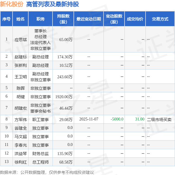 新化股份近半年内的董监高及核心技术人员增减持详情如下: