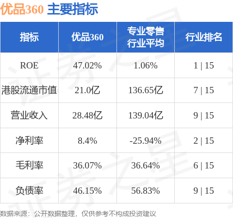 优品360港股市值21亿港元,在专业零售行业中排名第7。主要指标见下表:
