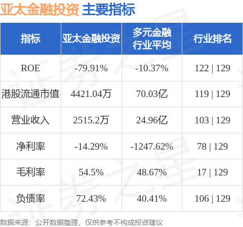 亚太金融投资港股市值4421.04万港元,在多元金融行业中排名第119。主要指标见下表:
