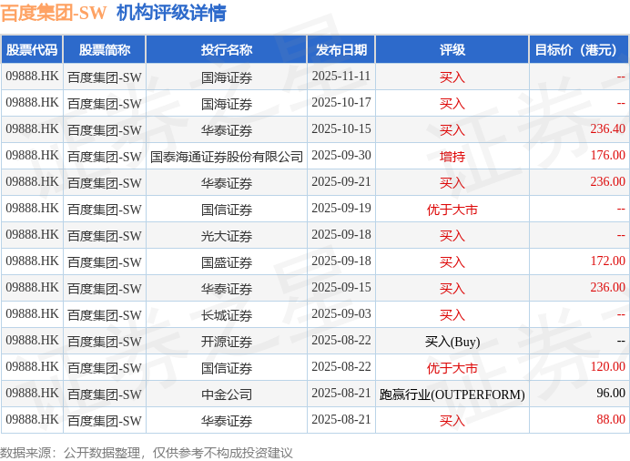 投行对该股的评级以买入为主,近90天内共有9家投行给出买入评级,近90天的目标均价为170.05港元。国海证券最新一份研报给予百度集团-SW买入评级。