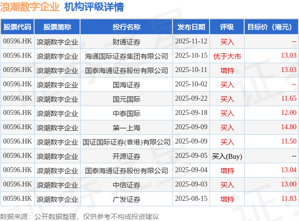 截至2025年11月13日收盘,浪潮数字企业(00596.HK)报收于8.15港元,下跌1.45%,成交量322.2万股,成交额2625.59万港元。投行对该股的评级以买入为主,近90天内共有7家投行给出买入评级,近90天的目标均价为12.65港元。财通证券最新一份研报给予浪潮数字企业买入评级。