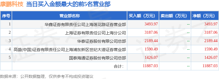 证券之星消息,沪深交易所2025年11月13日公布的交易公开信息显示,康鹏科技(688602)因有价格涨跌幅限制的日收盘价格涨幅达到15%的前五只证券登上龙虎榜。此次是近5个交易日内第1次上榜。