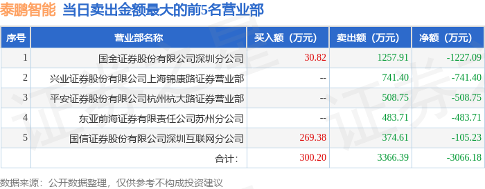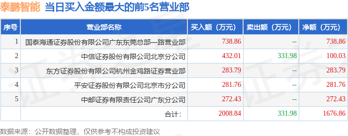 证券之星消息,沪深交易所2025年11月13日公布的交易公开信息显示,泰鹏智能(920132)因当日换手率达到20%的前5只股票登上龙虎榜。此次是近5个交易日内第1次上榜。