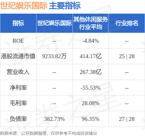 世纪娱乐国际港股市值9233.82万港元,在其他休闲服务行业中排名第25。主要指标见下表: