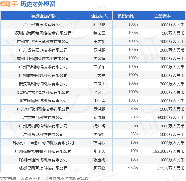 证券之星消息,根据天眼查APP显示,蜂助手(301382.SZ)新增一起对外投资事件,被投资公司为广东极算技术有限公司,法定代表人罗洪鹏,投资占比为100%。该公司从事软件和信息技术服务业,注册资本为1000万人民币。目前,蜂助手共存在对外投资18项,详见下表: