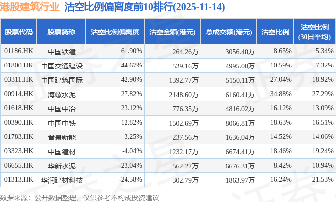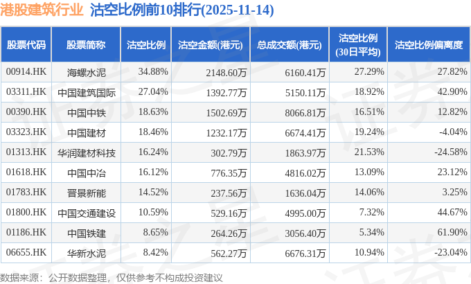 从沽空比例来看,海螺水泥、中国建筑国际、中国中铁沽空比例位居行业前三,分别为34.88%、27.04%、18.63%。