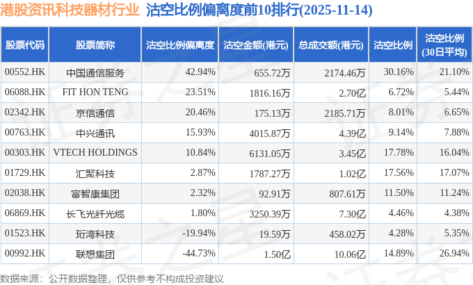 从沽空比例偏离度来看,中国通信服务、FIT HON TENG、京信通信沽空比例偏离度位居行业前三,分别为42.94%、23.51%、20.46%。