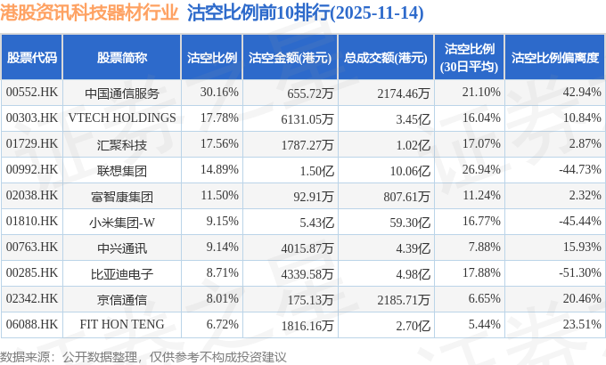从沽空比例来看,中国通信服务、VTECH HOLDINGS、汇聚科技沽空比例位居行业前三,分别为30.16%、17.78%、17.56%。
