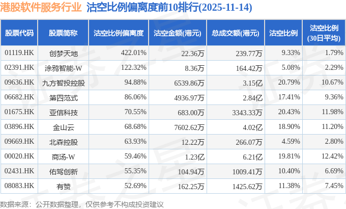 从沽空比例偏离度来看,创梦天地、涂鸦智能-W、九方智投控股沽空比例偏离度位居行业前三,分别为422.01%、122.32%、94.88%。