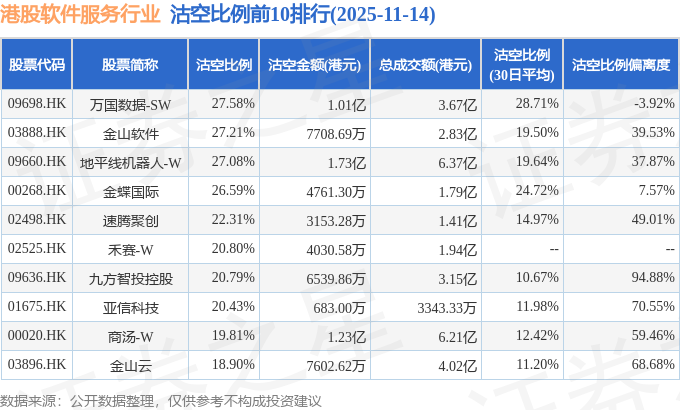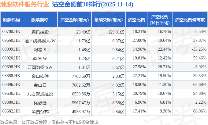 证券之星消息,11月14日港交所披露数据显示,当日港股软件服务行业的153只个股中有43只被沽空,总沽空股数为1.39亿股,总沽空金额为34.77亿元(港元),而当日软件服务行业的总成交金额为202.68亿元(港元),沽空比例为17.16%。当日软件服务行业总体跌2.25%。