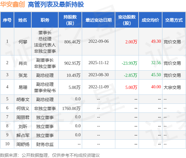 华安鑫创近半年内的董监高及核心技术人员增减持详情如下: