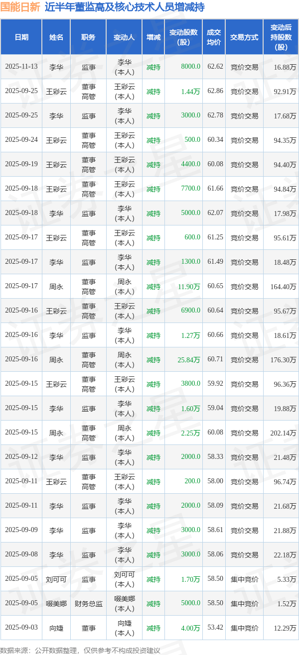 国能日新近半年内的董监高及核心技术人员增减持详情如下: