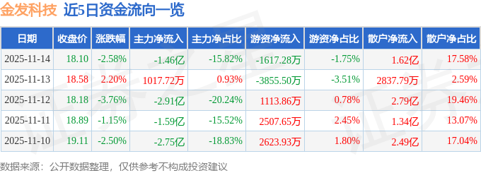 11月14日的资金流向数据方面,主力资金净流出1.46亿元,占总成交额15.82%,游资资金净流出1617.28万元,占总成交额1.75%,散户资金净流入1.62亿元,占总成交额17.58%。