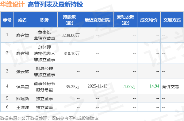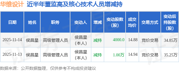 华维设计近半年内的董监高及核心技术人员增减持详情如下: