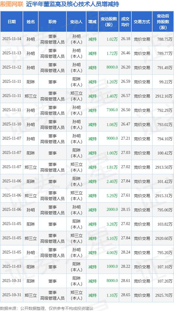 殷图网联近半年内的董监高及核心技术人员增减持详情如下: