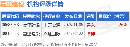 截至2025年11月17日收盘,嘉里建设(00683.HK)报收于21.68港元,上涨1.03%,成交量176.88万股,成交额3811.42万港元。投行对该股的评级以增持为主,近90天内共有1家投行给出增持评级,近90天的目标均价为26.4港元。申万宏源最新一份研报给予嘉里建设买入评级,目标价26.4港元。