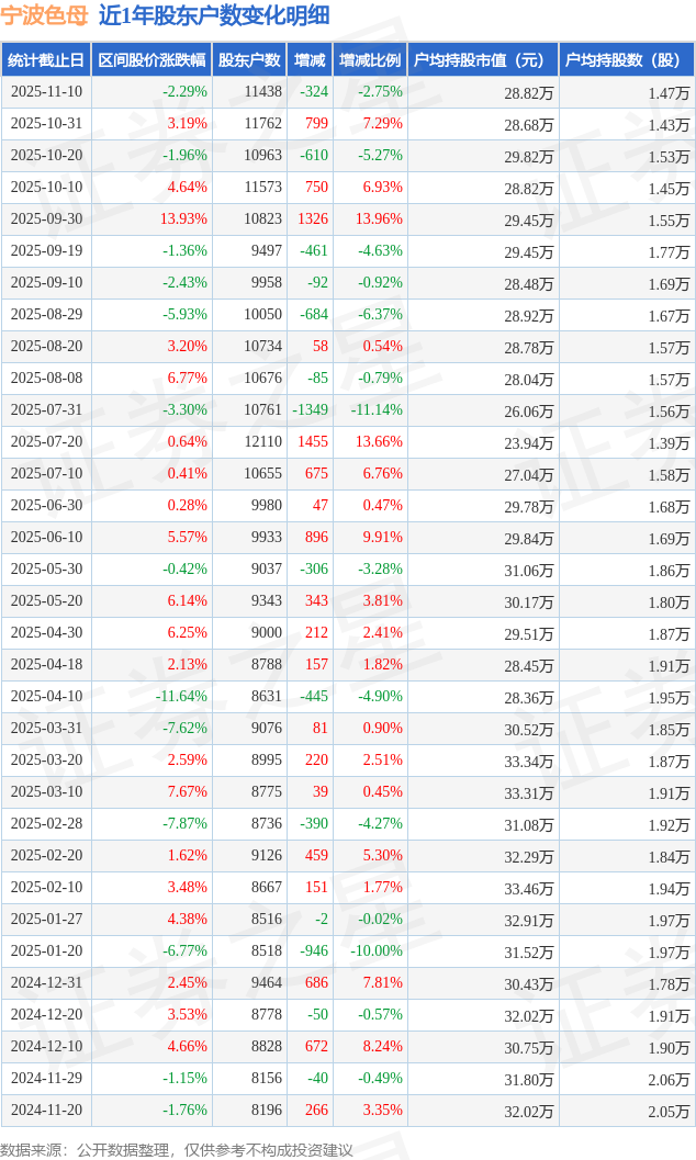 从股价来看,2025年10月31日至2025年11月10日,宁波色母区间跌幅为2.29%,在此期间股东户数减少324.0户,减幅为2.75%。