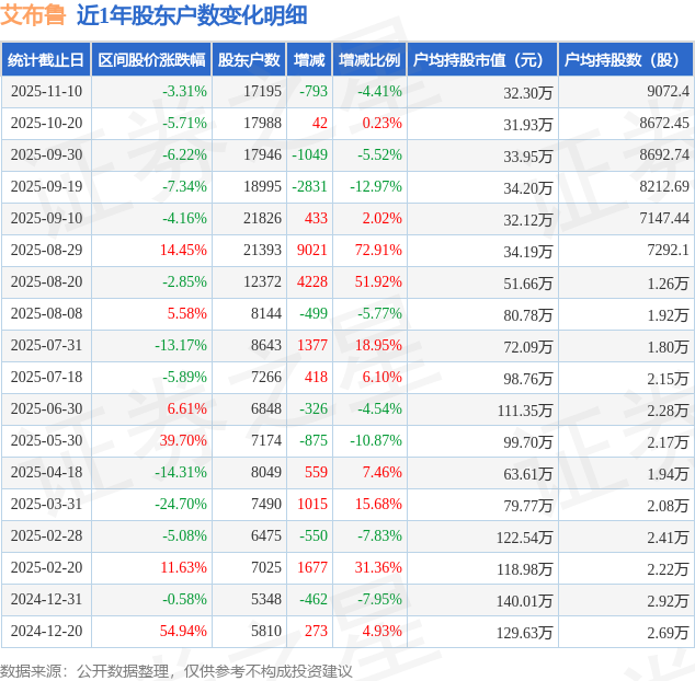 从股价来看,2025年10月20日至2025年11月10日,艾布鲁区间跌幅为3.31%,在此期间股东户数减少793.0户,减幅为4.41%。